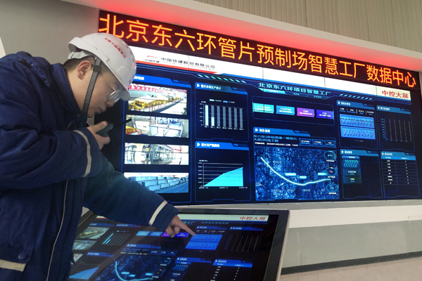 图为房桥公司员工正在北京东六环管片预制场智慧工厂数据中心通过信息化平台管控现场生产。王洋 摄